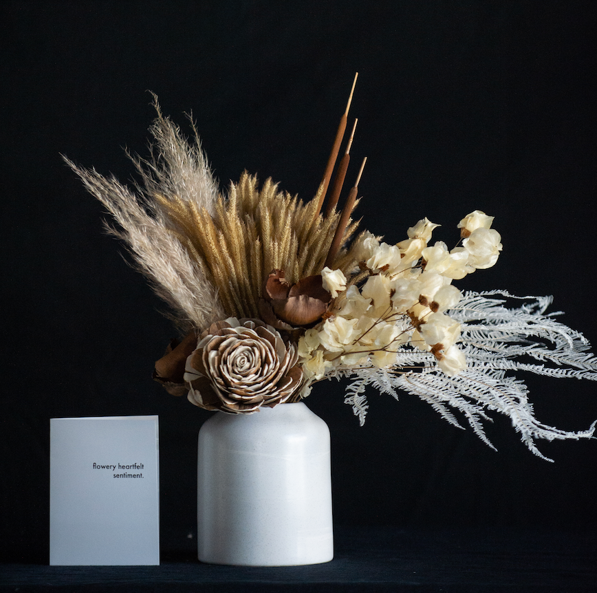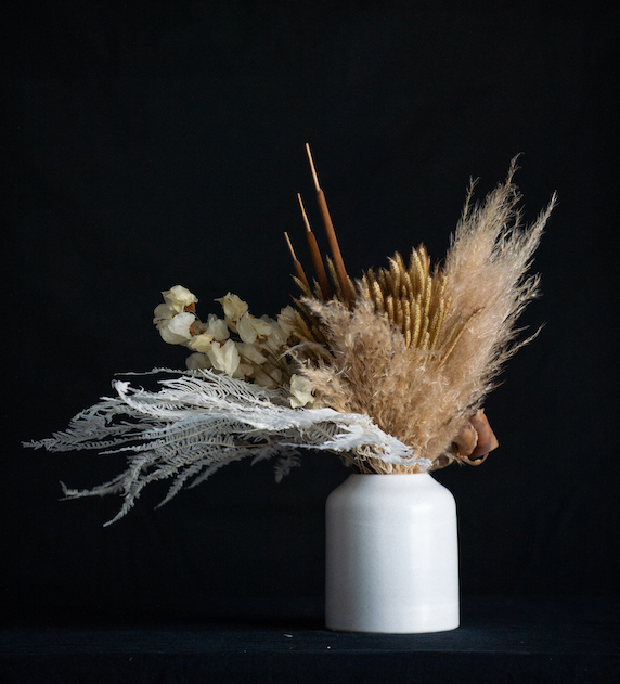 Hate it when your flowers die? Well, each of these designs is composed entirely of preserved and dried stems that are intended to last as long as you want to keep them! No watering required. *Please be aware that these stems are delicate*