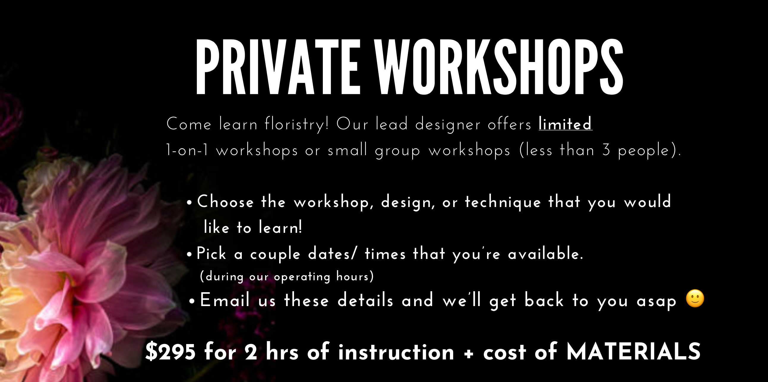 Our intimate workshops are limited to 10-12 guests and typically last around 75-90 minutes. You will be surrounded by our experienced team as you learn how to create a floral design (or something plant related). Each class highlights a specific theme, flower, or technique. All of our fully interactive workshops are guided step-by-step with all of the tools, florals, and materials provided. Curious about a private workshop? View available options here or send an email to info@azflowerbar.com